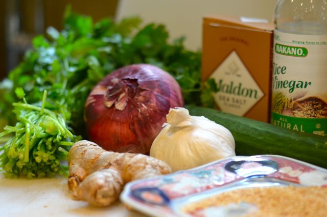 And they were quite complimentary. The ginger, onion and garlic are marinated in the dressing for a bit, so you still get their flavor with the cukes, but the harder, hotter edges are taken away. Sesame seeds and cilantro add some depth (we think peanuts would also be good) so the first bite was as good as the last. And the final benefit was timing, this salad was easy to make and took about the same time to prepare as the sashimi in broth. An excellent salad and a good foil to any flavorful or savory main dish.