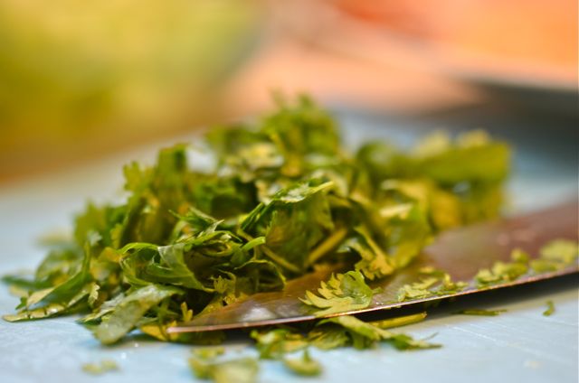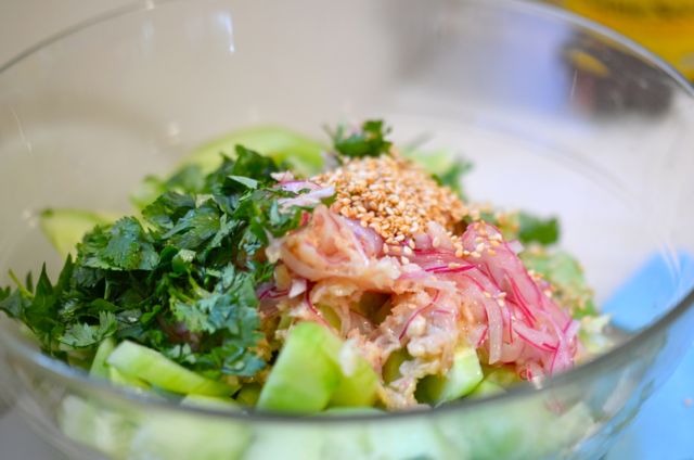 - Cut the cucumbers in half lengthwise and then slice, at an angle, into 1/4 inch slices. Add the cucumber to the bowl, followed by the sesame seeds and cilantro. Mix well and let sit for 10 minutes.