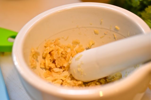 - Meanwhile, place the ginger and salt in a mortar (or small bowl) and pound well with a pestle (or other implement of destruction). Add the garlic and pound until the garlic is crushed into small pieces, but isn’t quite a paste. Scrape all the ginger / garlic mixture into the bowl with the onions and dressing. Mix until combined.