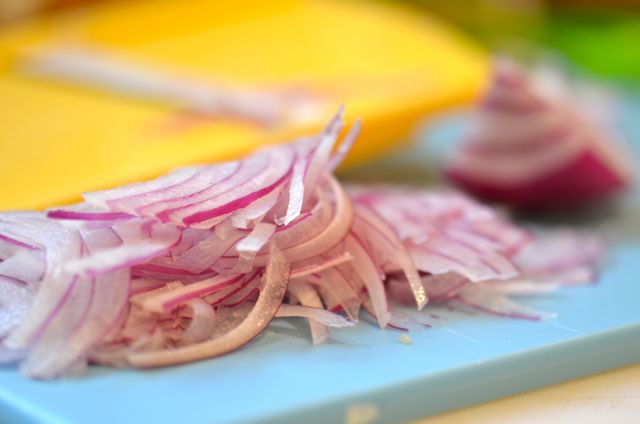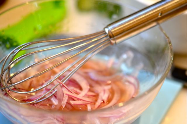 - For the dressing, place all the ingredients in a large bowl and whisk until combined. Add the sliced onion and mix until coated. Let sit for 45-60 minutes.
