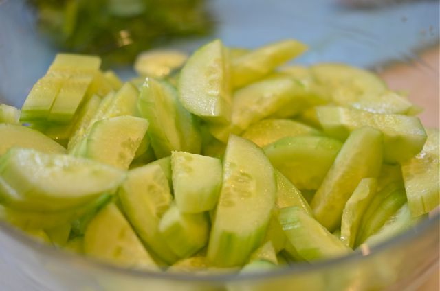 - And crisp cucumber will do here. Smaller ones are easier to chop, but just aim for bite sized pieces if using large cukes, it will take just a bit more time.