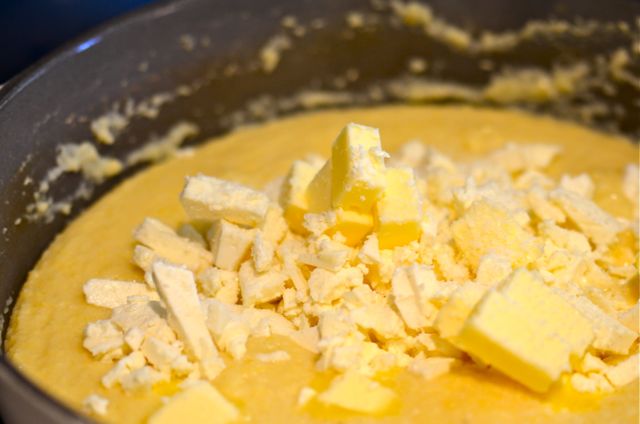 4. Return the corn paste to the pan and cook over low heat, stirring constantly, until you get a consistency like mashed potatoes. This will take 5 to 15 minutes depending on your corn mixture. When you get the consistency you like, fold in the butter, cheese, salt and pepper. Taste and adjust seasoning. Serve on its own or with the Eggplant Sauce.