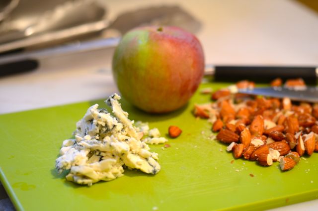 - To finish the salad, place the dressed greens on plates and top with a mix of the almonds, apples and blue cheese. Serve.