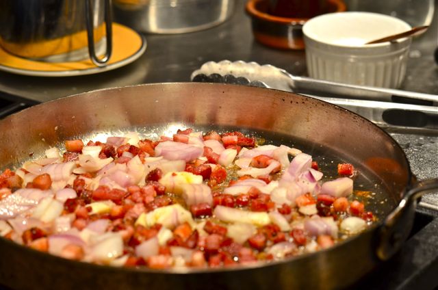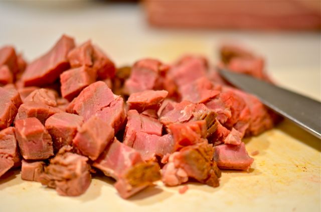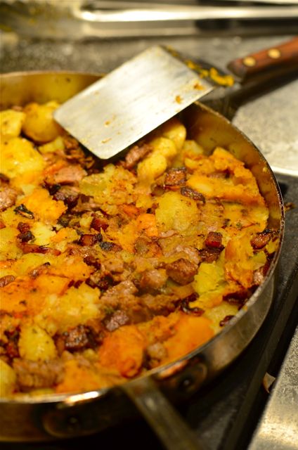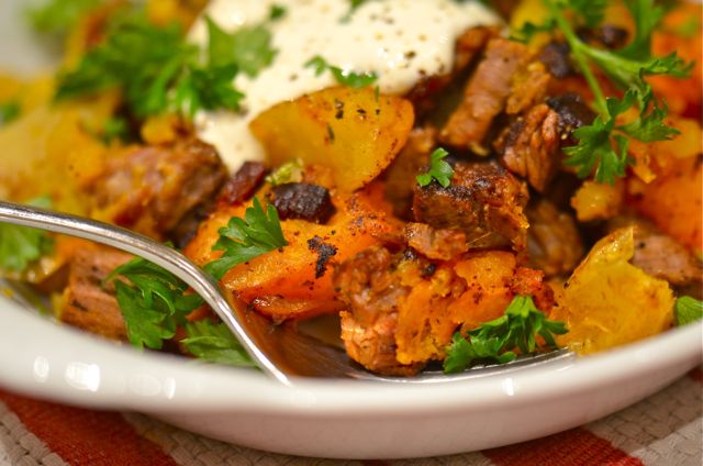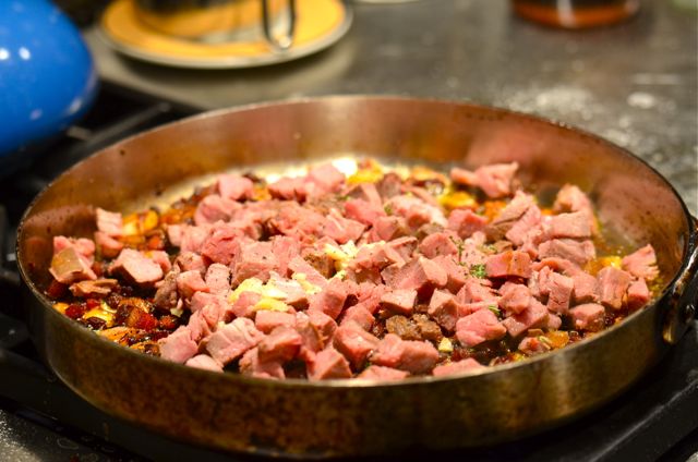 For this hash we used leftover beef, roasted butternut squash and boiled Yukon Gold potatoes seasoned with a bit of thyme, cumin and chili powder. It was great. But if we had leftover turkey, sweet potatoes, mashers or even creamed spinach or roasted brussels sprouts, we could use them (most stuffings will also work). Hard to go wrong here, as long as you liked the dish on Thursday, it probably work in hash on Friday….except for the cranberry sauce, best to keep that out of the hash.