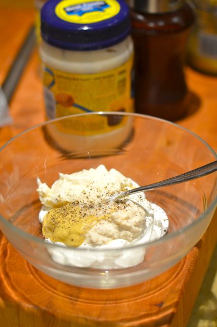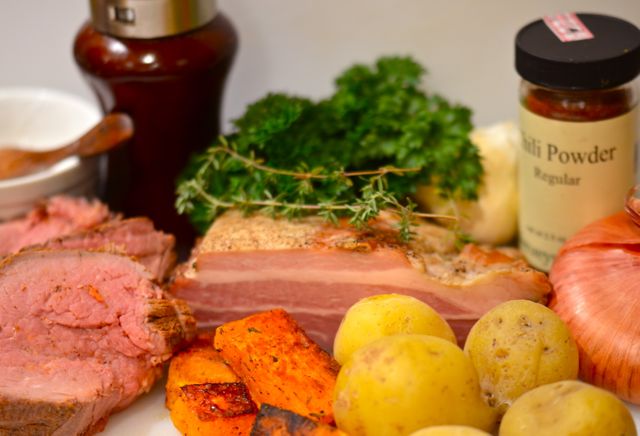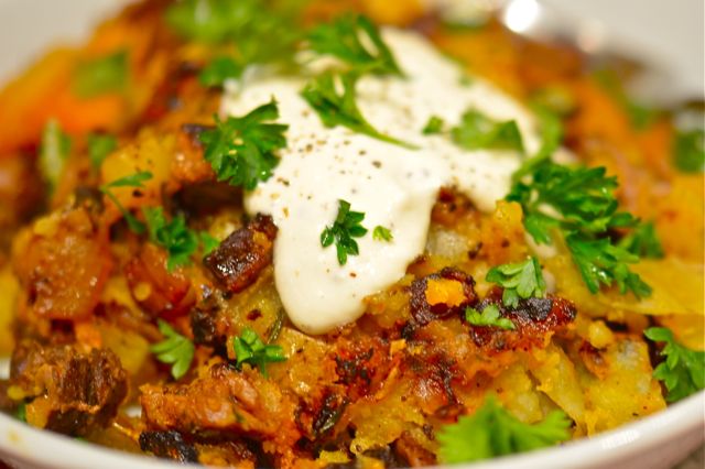 The key with making hash is to use what you already have and balance flavors and textures. Think about a mix of savory, sweet, vegetal and spicy flavors and soft, creamy and crispy textures (the browning will crisp up the dish). Pretty much any leftover you have may be worth adding, so be creative. And pre-cooked food is better in hash, as you don’t have to worry about even cooking of various raw ingredients. The only “fresh” ingredients we use are bacon, (to get its fat) onions and minced garlic we soften in the grease before adding the other ingredients. We top the hash with either a fried egg or a quick horseradish sauce (prepared horseradish, sour cream, mayonnaise, a touch of mustard, salt/pepper) but steak sauce or simple ketchup are just fine as well.