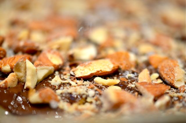 4. Spread the chocolate chunks over the hot sugar mixture. Let sit five minutes, the chocolate will melt. Spread chocolate over sugar mixture with a spatula. Then lightly dust with finishing salt. Sprinkle the remaining half of the almonds over the chocolate.