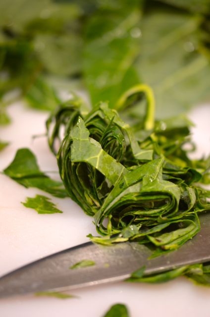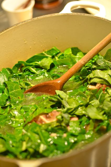 collards2colards3collards4Unfamiliar with collard greens? Basically a forerunner of kale (and in the same family) collards are big leafy greens with larger, rounder leaves than kale and with a bigger, earthier flavor. The main differences (that we know of) is that collards need to cook longer than most types of kale and loses its color a bit more during cooking. But the flavor is so rich, and so deep, that we prefer collards to kale for long slow cooking, particularly if pork is involved.