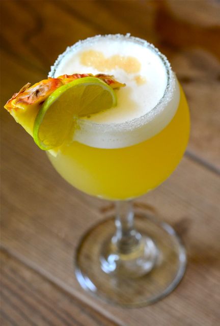 The Hanalei Sour combines fresh muddled pineapple, lime juice, coconut sugar (or just superfine sugar), Koloa Gold Rum and Tiki Bitters (Angostura in a pinch). We also garnish with fresh pineapple, lime, rim the glass with the coconut sugar (vanilla sugar would also do well here) and add some bitters to the foam on top of the drink. Is this really a sour? Or more tiki? Not sure. But we are sure it tastes good.