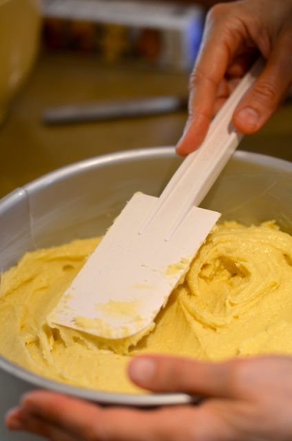 3. In a food processor, cream the butter and sugar. Add the almond paste in small pieces, processing until the mixture is smooth. Add the egg yolks and pulse until incorporated. Add the almond extract and sour cream mixture and pulse until incorporated. Now add the flour mixture and pulse until the flour is fully mixed into the batter (scrape down the sides with a spatula, if needed).