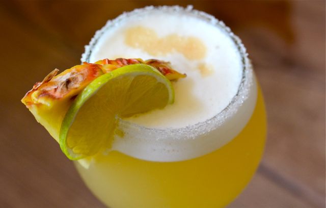 sour3The Hanalei Sour combines fresh muddled pineapple, lime juice, coconut sugar (or just superfine sugar), Koloa Gold Rum and Tiki Bitters (Angostura in a pinch). We also garnish with fresh pineapple, lime, rim the glass with the coconut sugar (vanilla sugar would also do well here) and add some bitters to the foam on top of the drink. Is this really a sour? Or more tiki? Not sure. But we are sure it tastes good.