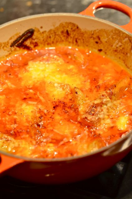 forno6In this recipe you cook fennel and aromatics in a broth of fennel seeds, thyme, saffron, tomato paste and chicken (or vegetable) stock. Then you put the fennel in a gratin dish, add some mozzarella and parmesan cheese and bake the whole thing. Sounds good, huh?
