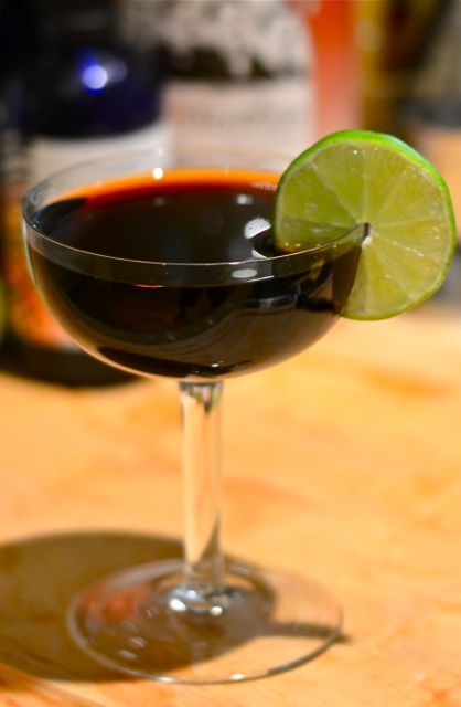midSo what did we do with the stuff? Experiment, of course. But after a while we made our own creation, the Midnight Daiquiri. The Midnight Daiquiri uses Cruzan Blackstrap rum (you could sub Gosling’s or Meyer’s), lime juice, falernum syrup, coffee liqueur and bitters. The sip starts with a bittersweet molasses nose and then a sweet, spicy “rum, lime and coke” flavor that ends with a slightly bitter note that cleans the palate. A very easy sipper, more refreshing than you might think and certainly worth a try.