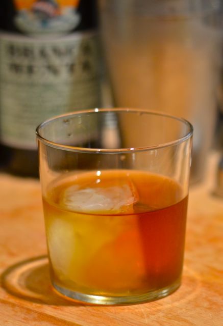So what to make with the Menta? That was also easy. We have to admit that neither of us have ever had a Stinger, the classic combo of Cognac and Creme de Menthe. And there is a reason for that- it sounds totally nasty (and like a waste of good Cognac). But we figured the Menta would make for a better version of the Stinger. And after a little research, we found a good recipe for an “Improved” Stinger using the Menta from the blog Caskstrength. Excellent.