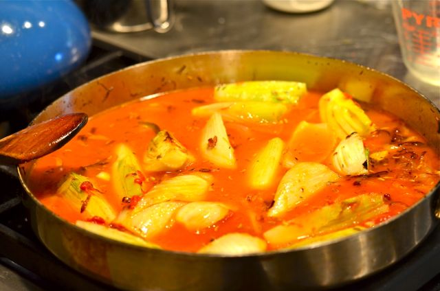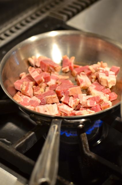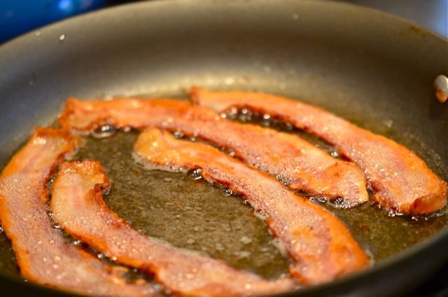 - Place a large skillet over medium heat. Cook the bacon until crisp and remove from the pan, but keep the fat in the pan. Add the onions to the pan, move the heat to medium-low and cook until browned and soft, about 15 minutes. Season to taste.