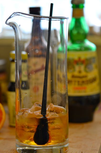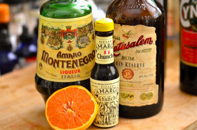 Since we had the orange twist and the herbal, coffee-ish notes of the Amargo Chuncho bitters, the big question was the choice of aged rum and amaro. We wanted a mild, slightly woody sipping rum, and after trying a few bottles settled on the Matusalem Gran Reserva, a 15-year-old rum with well-integrated floral and burnt sugar flavors. The Matusalem is an easy sipper, and a good fit for this kind of spirit-forward cocktail. As for the Amaro, we tried a bunch. Maria a Monte was good but a bit too minty and boozy (worth revisiting, good stuff), Cynar didn’t quite fit and Averna was too sweet. We settled on Amaro Montenegro with its less bitter, light herbal and orange peel notes.