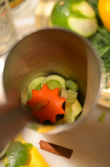 And since gin often features the anise and citrus flavors we find in fennel and some gins (Hendrick’s) favor cucumber, we figured we could start with the traditional juniper and build a “gin” with veggies, herbs, citrus and spices. In the end, we used juniper berries, cinnamon (cassia), baby fennel (more citrus notes), fennel fronds, cucumber slices, rosemary, lime peel, lemon peel and Cara Cara orange peel. We muddled like crazy, then added some vodka (a good use for vodka, you could never predict how gin would respond to all these new flavors) and then muddled some more. And then it got interesting.