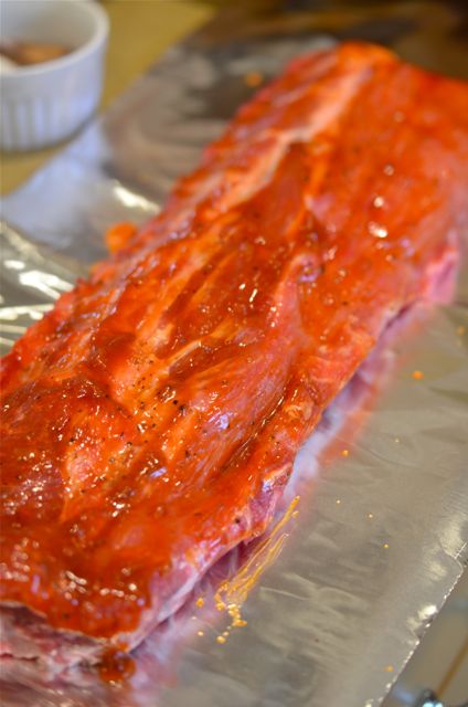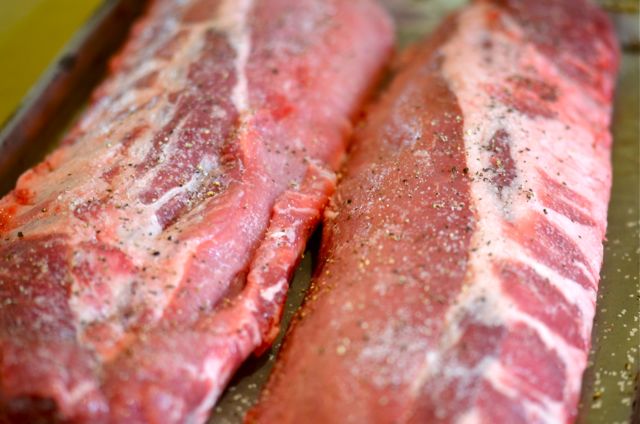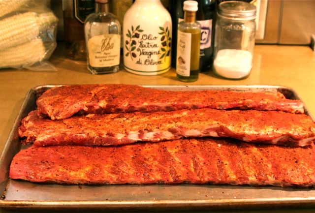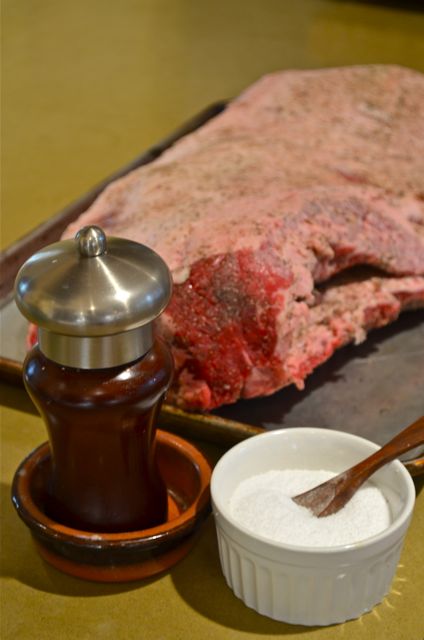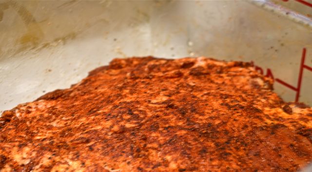 “Rubbed” pork shoulder, note the liberal application of dry rub.