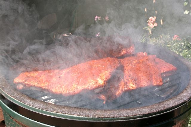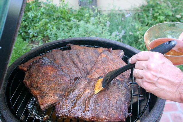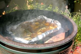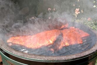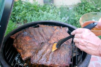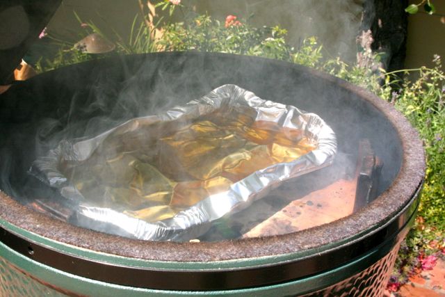 So once you brine and rub the pork, you are ready to smoke. If you have a dedicated smoker, that is great (we use a Big Green Egg- very good tool). If not, most grills have instructions for smoking, please follow them. Weber kettle grills are easily adapted to smoking and do a great job. Gas grills also work. The key is to cook low and slow and get good smoke. We use a mix of 50/50 applewood and hickory and soak the woodchips or chunks for at least 30 minutes. Soaking the wood is critical, you want the wood to smoke, not burn. The other critical element is temperature control. You want to keep an even temperature at about 210 degrees. It usually takes some time to control the airflow on your smoker to reach, and maintain, the right temperature, but it’s worth it. The goal is to slowly build the internal temperature of the pork to at least 190 degrees- this is what gets you the “finger-licking” texture of great barbecue. Normally this will take 8-10 hours, but there are other ways that save you a little time.