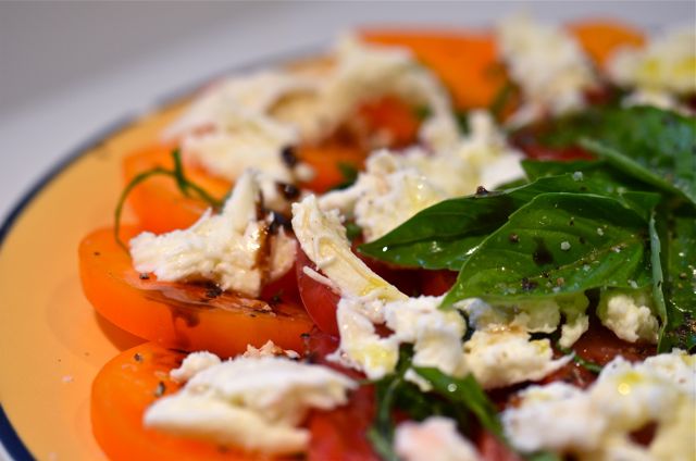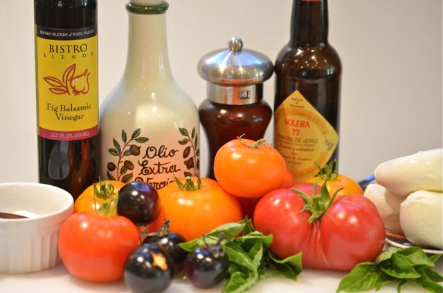 And while the Caprese salad is a very common recipe, there are a few ways to make the most of the dish. Firstly, you need fresh ingredients. Ripe tomatoes and fresh basil are key, as is good quality mozzarella. If you have a good local producer of mozzarella, try their cheese. If not, ask a good cheesemonger for a recommendation, as there are good nationally distributed mozzarella. Secondly, adding salt, pepper, olive oil and vinegar will add flavor and depth to the dish- without distracting from the core ingredients. Using two vinegars also brightens the flavor, we like sherry and balsamic vinegars, just not too much. Third, using a variety of tasty, ripe tomatoes provides more flavors and textures- and it looks good too (although most Caprese salads look good). UPDATE: And finally, as Stefan from Stefan’s Gourmet Blog (one of our faves) points out in the comments below, letting the cheese come to room temperature is a big help- it improves both the flavor and texture.