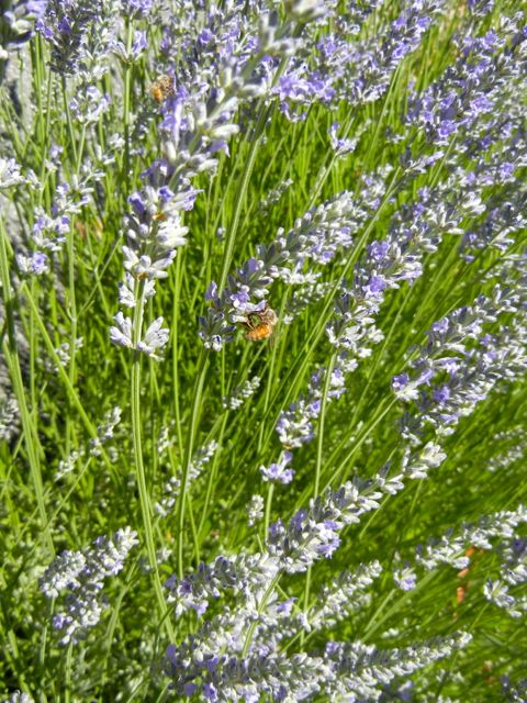 But while the pastures are brown, our gardens are overflowing with green..and purple. Let’s start with the purple. Our lavender, once just on the cusp, is in full bloom. It will last for months and the honeybees will work it, almost exclusively, for the rest of the summer. Here at the “farm” summer comes with a soundtrack, the constant humming of bees in the lavender. Both the honeybees and the native bees enjoy the lavender and completely ignore us, and everything else, while they work the flowers. Happily, the native bees will work / pollinate some of the other plants, while the honeybees seem to focus on the “highest and best” sources of nectar. That focus is what gives us “varietal” honey like clover or orange-blossom. I guess we basically get lavender honey.