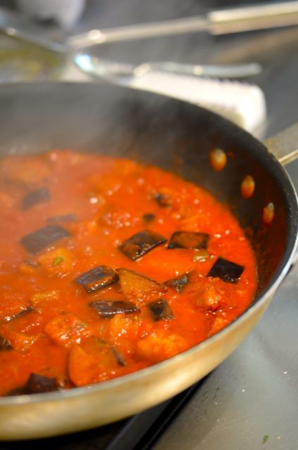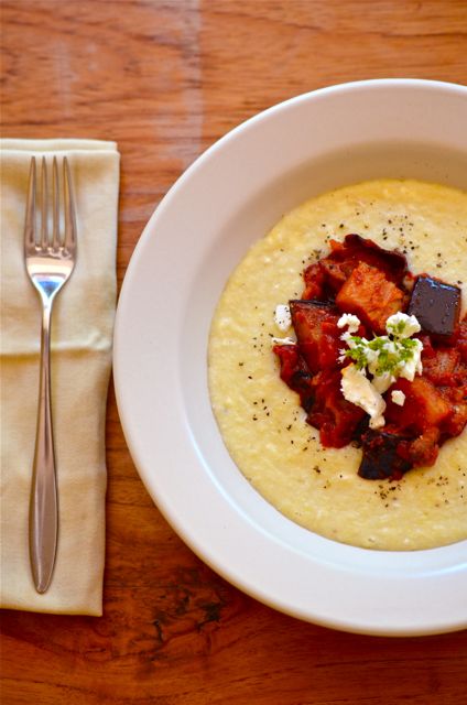 This recipe is really two dishes. The first is a corn polenta where you cook fresh corn kernels, then process them and add a bunch of butter and feta cheese. You get something like mashed potatoes with the sweet flavor of good polenta but with a creamy, light(er) consistency. The sauce combines fried eggplant with tomatoes in a quick reduction that yields sweet rich flavors. These dishes are good in combination, but either would work on its own. We served the left over polenta with a bit of bacon and green onion and it was very good. As for the sauce, you could easily serve it with rice or pasta.