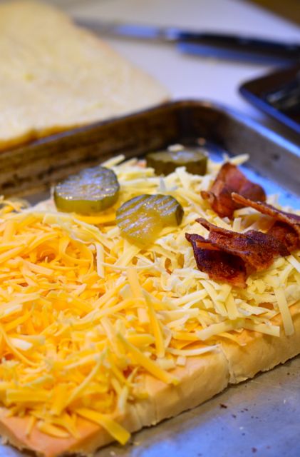 So what is the big deal here? Basically you get a sheet of 12 of sweet rolls, some areas have King Hawaiian rolls, some have potato rolls, some Parker House rolls. (Look at the photos, you will see what we mean.) You cut them in half, flip them over, so the “rough” side is out, butter and lightly salt the exterior, put a bunch of good cheese and other stuff in between the layers and grill the sandwich. Serve it when the cheese melts and then “pull-apart” the sections. Watch the melted cheese do its thing. Eat. Repeat. Smile.