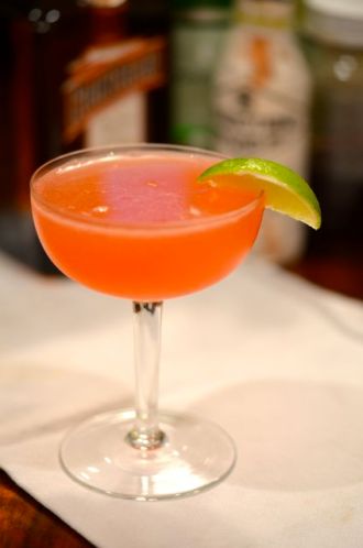 - Combine all the liquid ingredients in a cocktail shaker with ice. Shake thoroughly and strain into a chilled cocktail glass, coupé or flute. Garnish with lime wedge. Serve.
