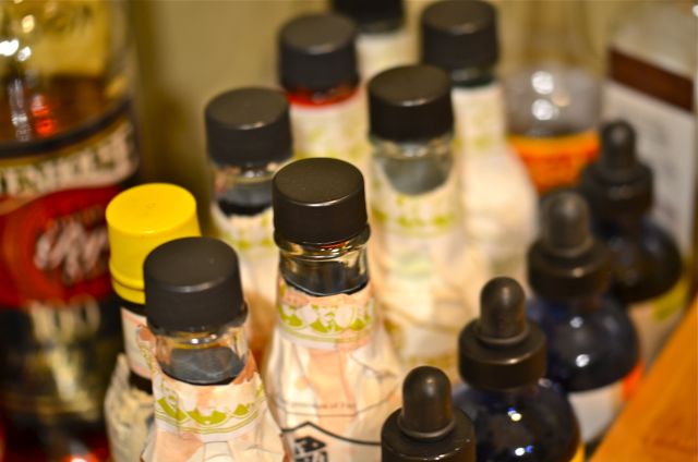 As for us, we found this theme somewhat more challenging than expected. We created two drinks, but also failed repeatedly to make our third, a champagne-based cocktail that tasted and looked like Napa Cabernet (some things simply aren’t meant to be, and who wants a cocktail to taste like wine anyway?). Oh well. In any event, here are all the cocktails (mostly) in the order we got them: