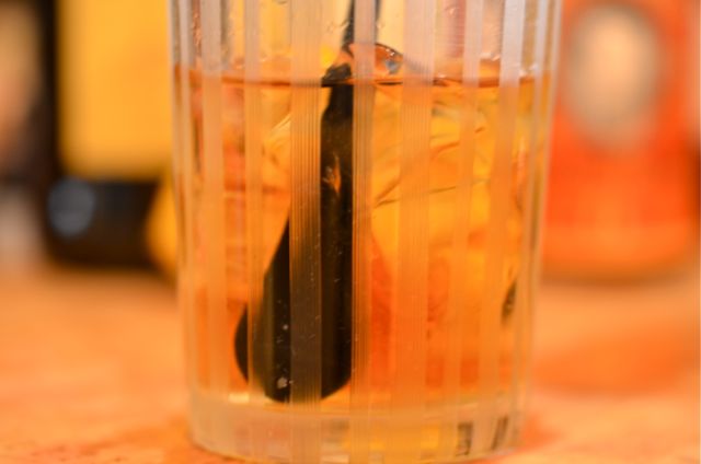 Shake Strain and Sip took the inverted theme to another place altogether and put the drink inside an ice-cube. The Alice’s Looking Glass is a very cool, and very tasty, creation with rye and Aperol in the lead. (We made it with regular ice, still great).