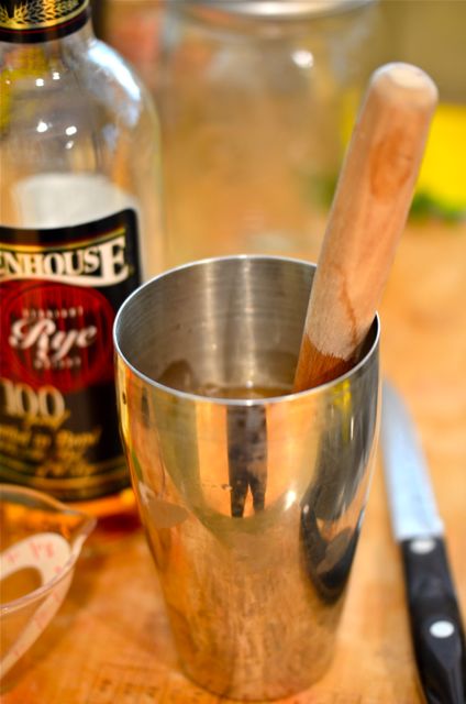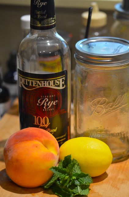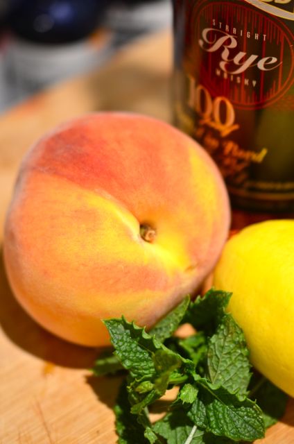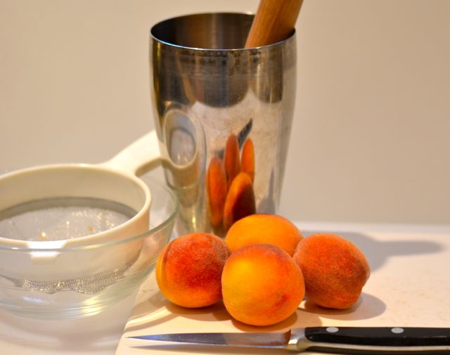 As for the cocktail to mix, this is the easy part. Ripe stone fruits call for a smash. Smashes are one of the great old-time cocktails from way back in the Jerry Thomas era (like 1880). Originally, a mixture of whiskey, lemon, mint and sugar, the basic recipe is easily extended to seasonal fruit, with peaches and nectarines being a particularly good fit. Smashes fell out of fashion a few generations ago, but cocktail historians like David Wondrich helped to bring them back. And not too soon afterwards, expert mixologists like Dale Degroff came up with variations like the Peach Smash, a smash with bourbon, peaches, lemon, mint and a special honey syrup. A good foundation to work from.