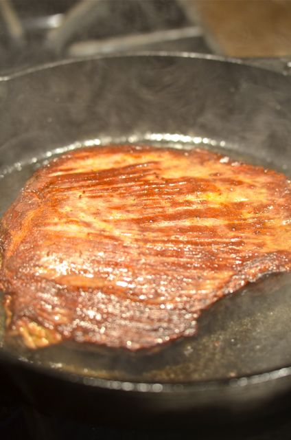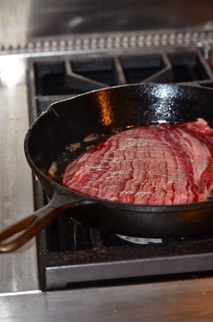 As for the cooking method, we are all for outdoor high-heat grilling (or even a long, slow sous-vide cook, followed by grilling or pan-searing), but the quick, easy way to cook a flank steak is to pan fry it briefly in a very, very hot pan. Just be sure it is a heavy pan (cast iron is very good here), your kitchen is well-ventilated and you use a high-heat cooking fat like bacon fat or peanut oil. Then you cook the flank steak for 5-7 minutes (for medium-rare) on each side, until well-browned, then let it rest for at least 10 minutes before slicing. The meat will finish its cooking during the rest, and the juices will also settle and not run all over your cutting board when you slice. Again, a little extra time makes a difference.