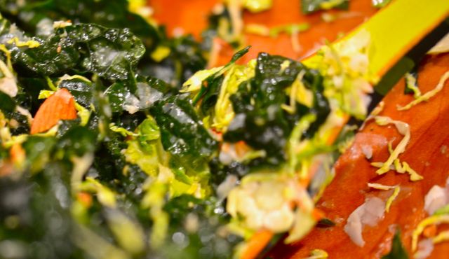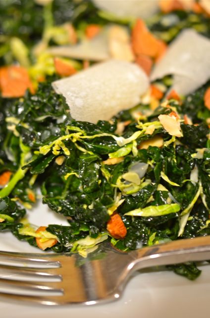 Simple enough, but there is one extra step that makes this salad really sing, the “massage”. And no, there is nothing creepy about massaging your kale. What’s really going on is that you add some of the lemon juice from the dressing to the kale and sprouts, mix or “massage” the juice with the greens and then let them sit for 5 to 20 minutes. The acid will actually start to “cook” or soften the kale and sprouts. It makes a big difference in texture of the salad. Usually dressing a salad too early makes it wilt, but for a tough green like kale, this is a good thing. (This approach will work for most kale-based salads).